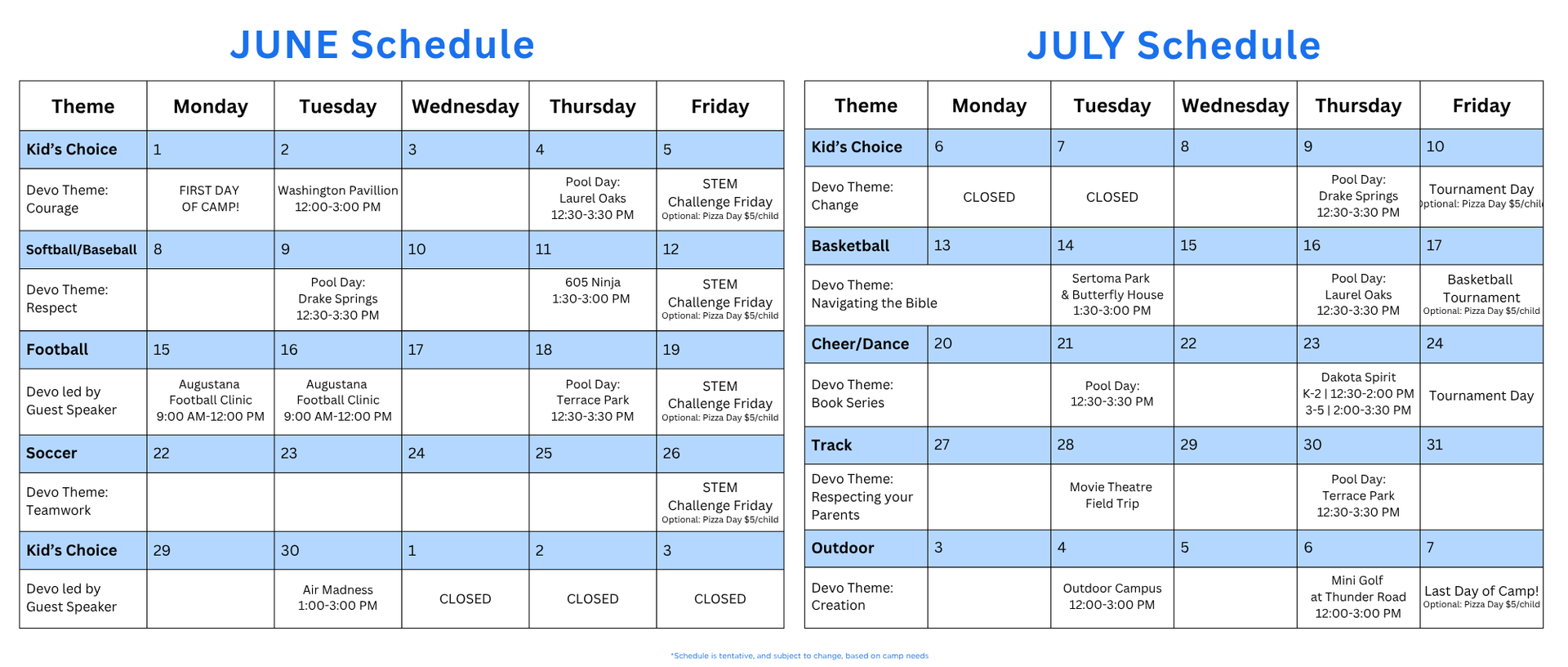 Weekly field trips are OPTIONAL and are an additional cost. If your child is attending 7+ weeks, there is an option to pay in full, which includes field trip fees.